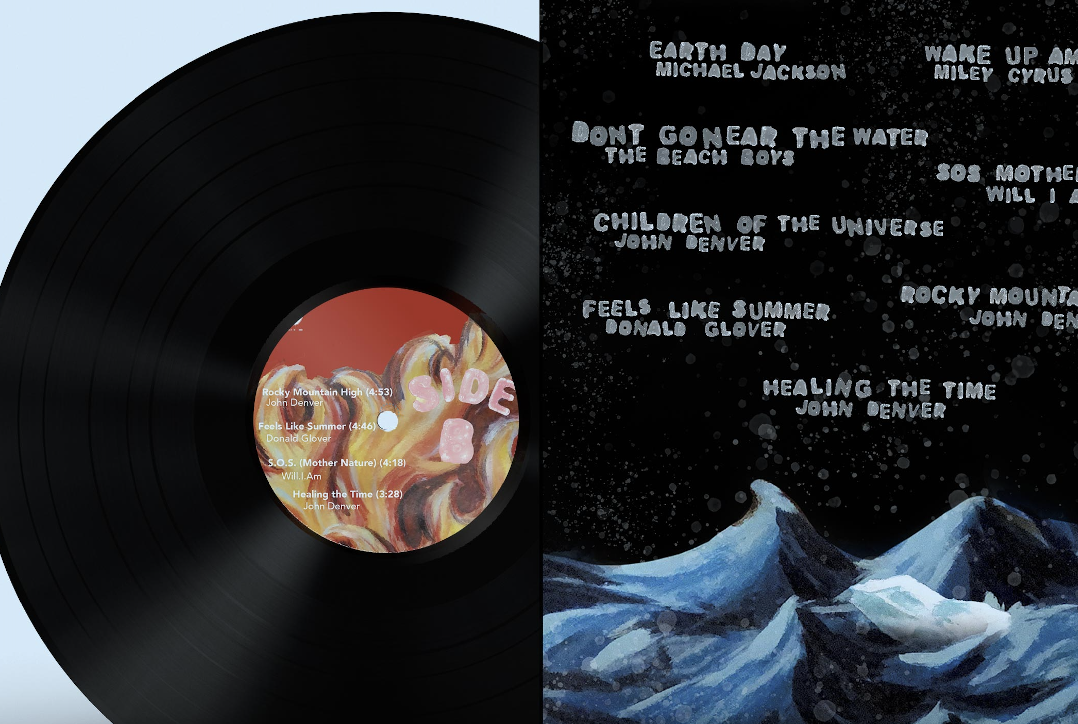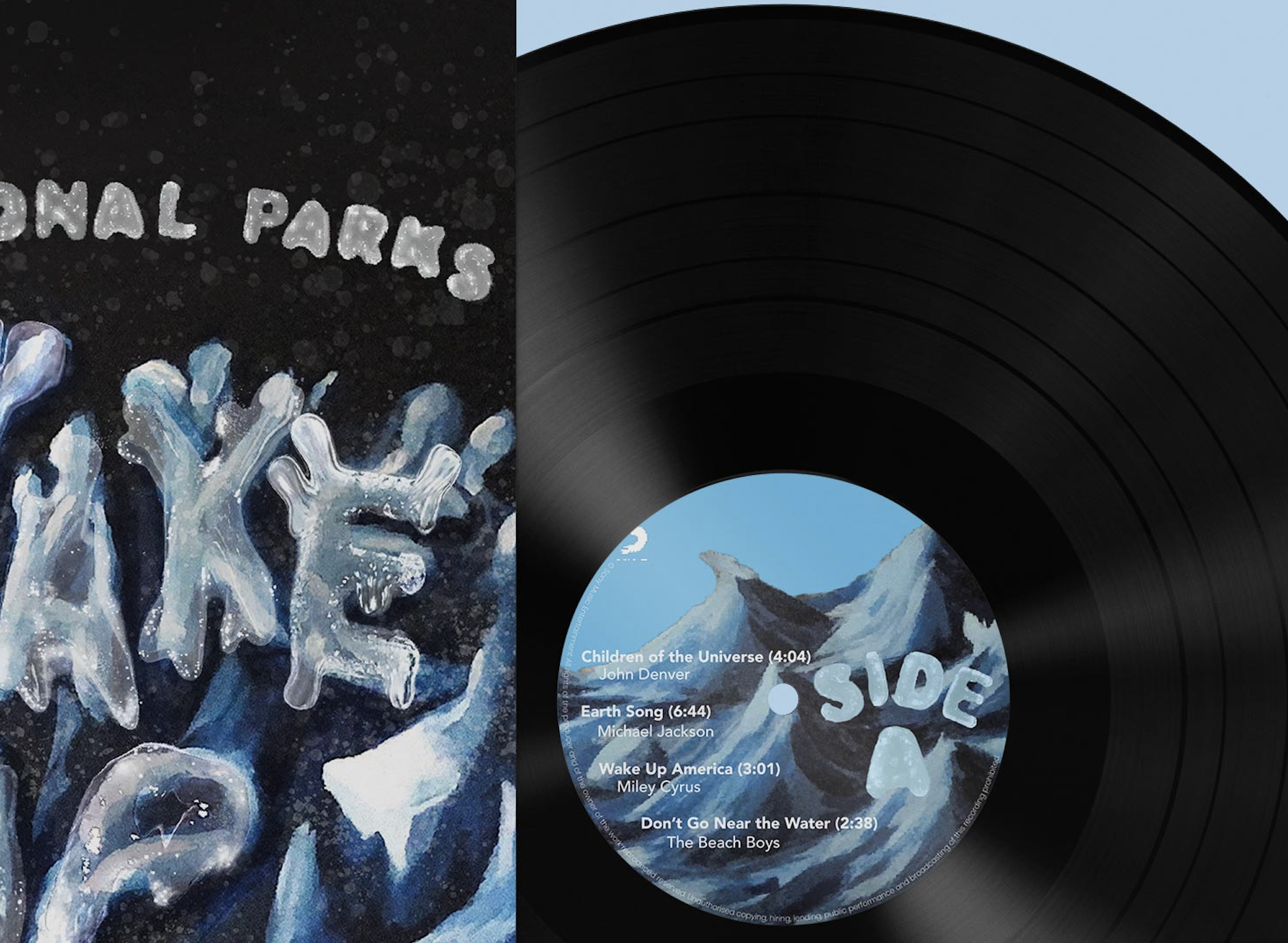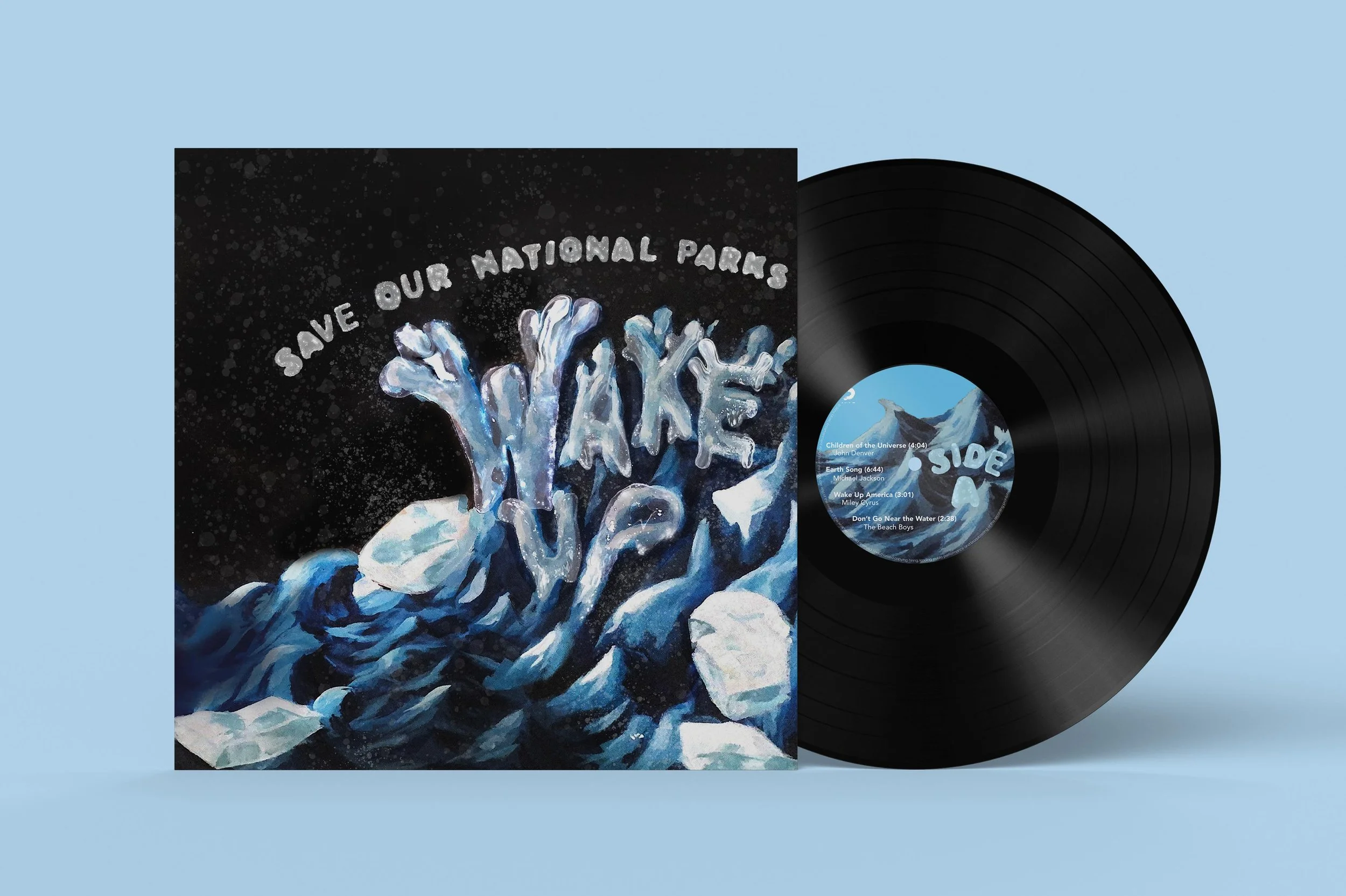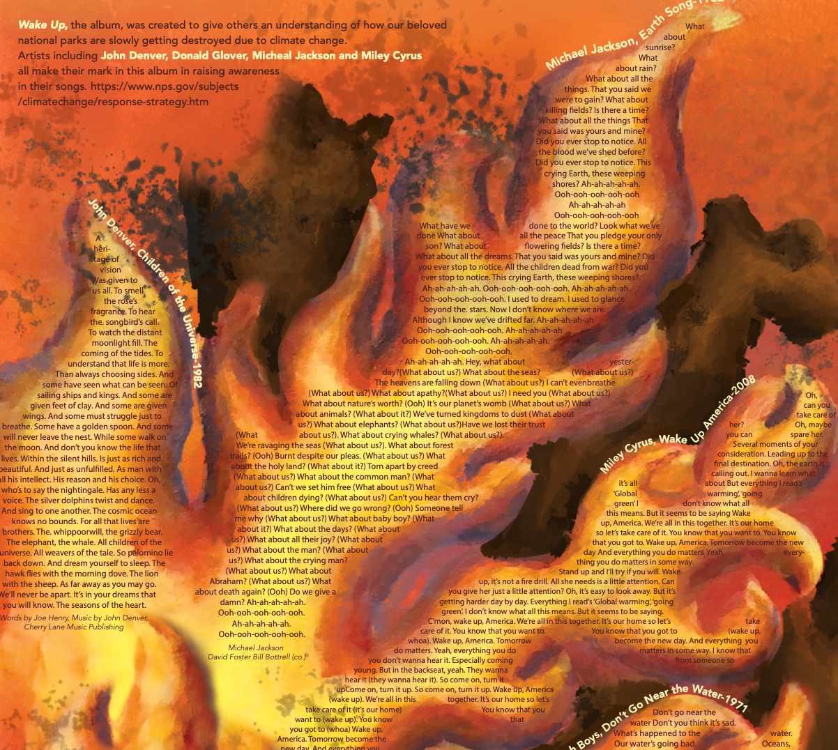 Wake Up, the album cover is a visual identity system to bring awareness on climate change and how it is slowly destroying our national parks. With a limited color palette, the front and back on the album display mainly blues and cool tones to represent Glacier National Park. Whereas on the interior panels we see warmer tones to represent Yellowstone National Park. All illustrations are painted and digitally modified slightly on photoshop.